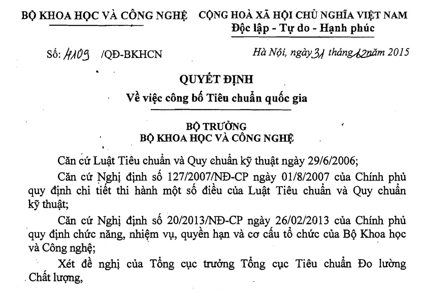 Quyết định số 4109/QĐ-BKHCN ngày 31/12/2015 của Bộ Khoa học và Công nghệ về việc công bố Tiêu chuẩn quốc gia. Tài liệu đính kèm: qd_4109_cong_bo_tieu_chuan_quoc_gia.pdfTừ khóa: 4109