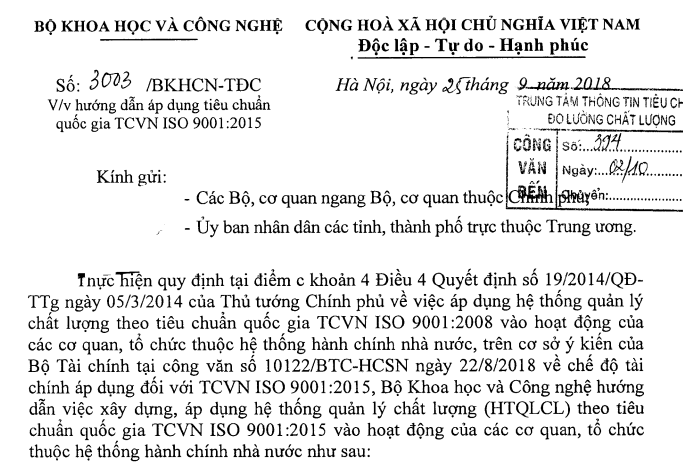 Công văn số 3003/BKHCN-TĐC ngày 25/9/2018 của Bộ Khoa học và Công nghệ về việc hướng dẫn áp dụng tiêu chuẩn quốc gia TCVN ISO 9001:2015.